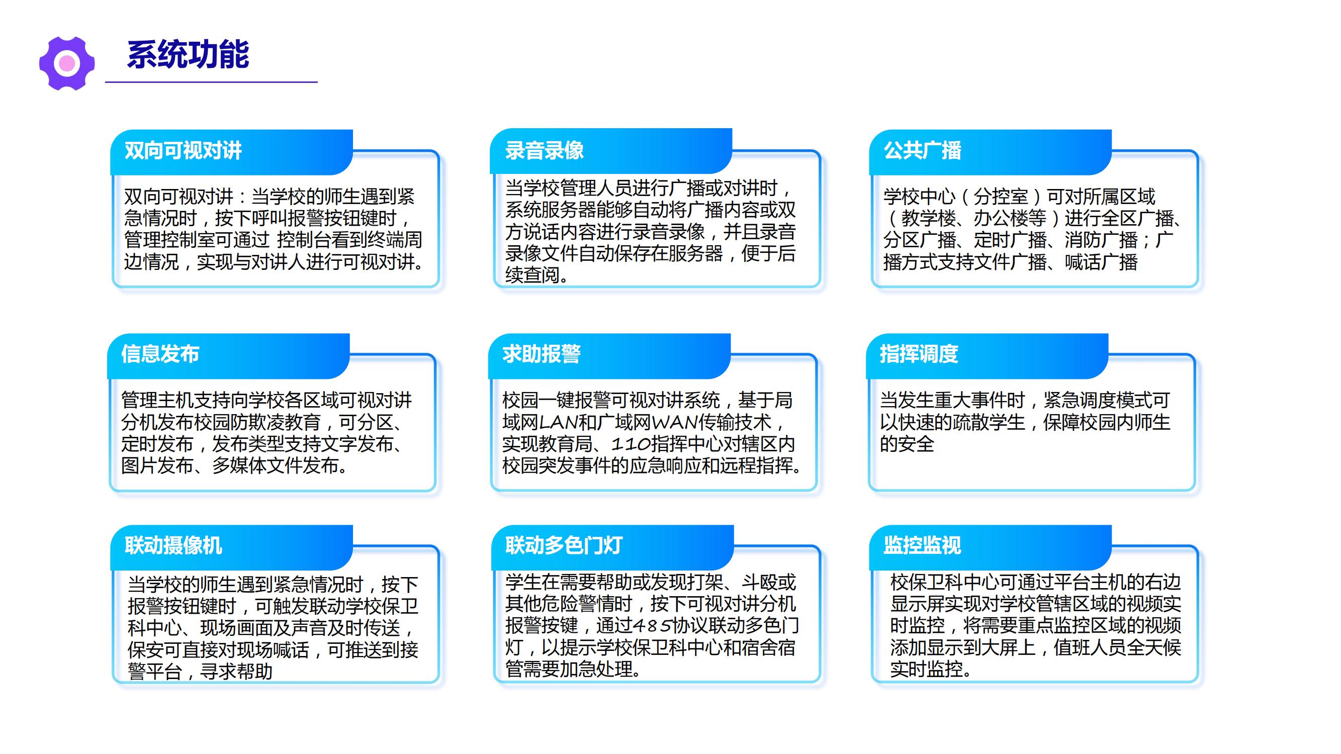 校園一鍵報警可視對講系統,利用校園網設計一套數字1P網絡內部對講系統,可視對講廣播系統與校園廣播、門禁控制、電子地圖等管理系 統集成智慧校園綜合管理平臺,實現一體化、數字化、集成化的高效管理平臺系統,提升學校的綜合管理水平,逐步實現數字校園、平安校 園、智慧校園的建設目標。